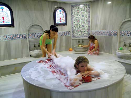 Банщик («Tellak») – мыться самому в турецкой бане не принято, банщик делает процедуру мыльного массажа - пилинга или традиционного массажа. Для мыльного массажа употребляют натуральное оливковое мыло с экстрактом эвкалипта, пена взбивается в большом полотняном мешке.